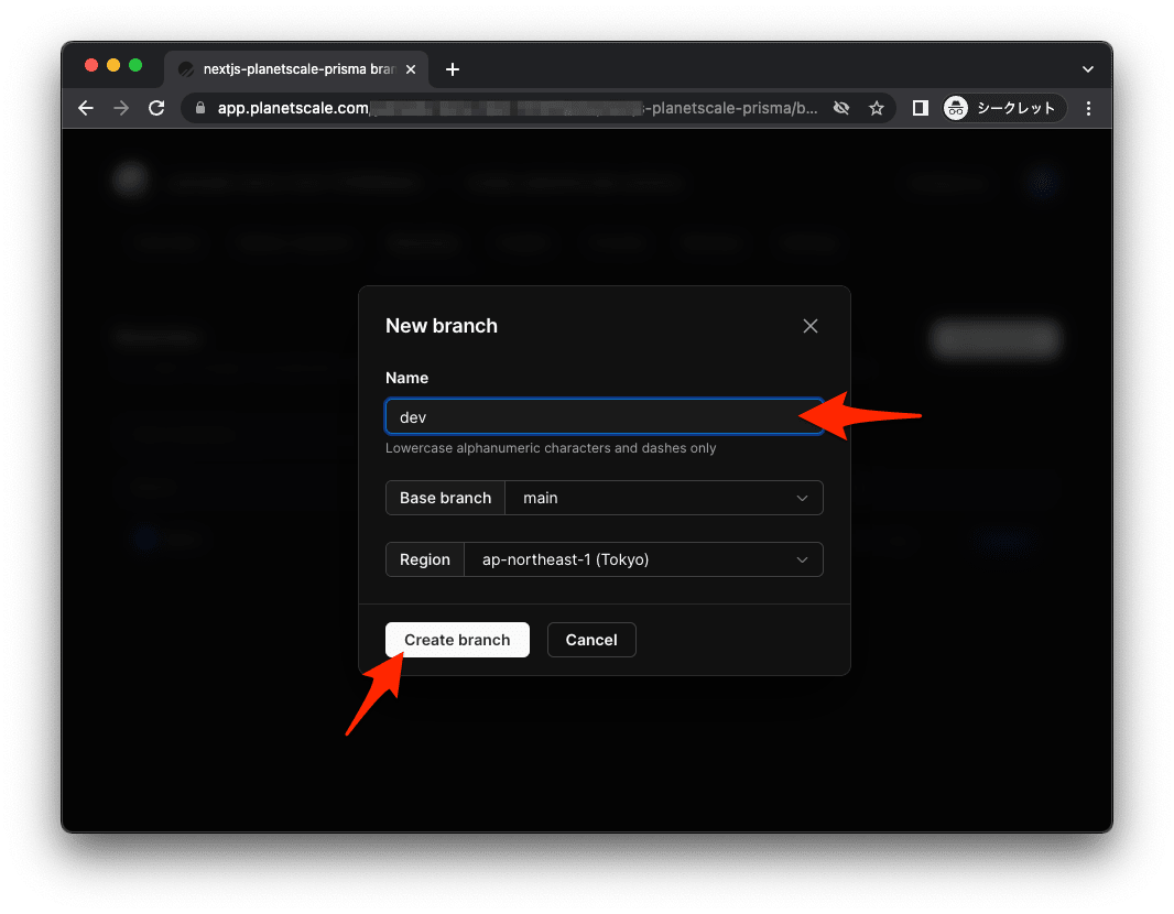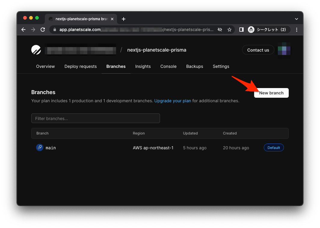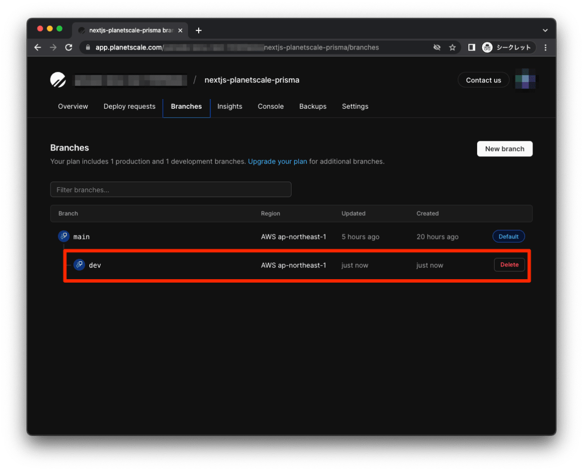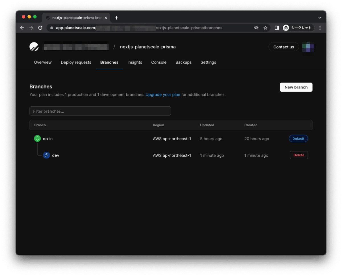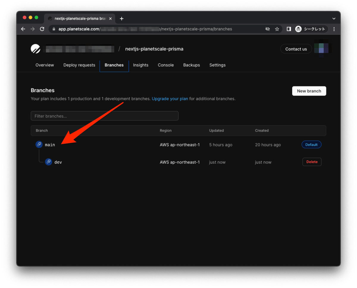 PlanetScaleで開発ブラントを作成する