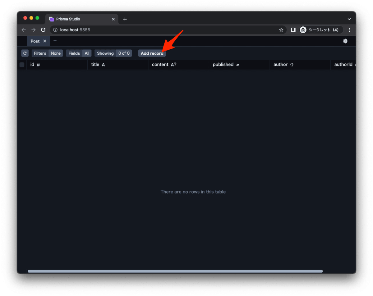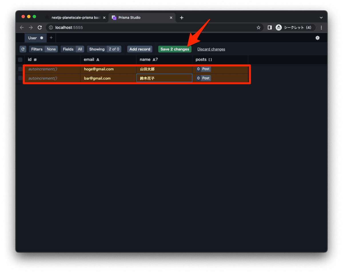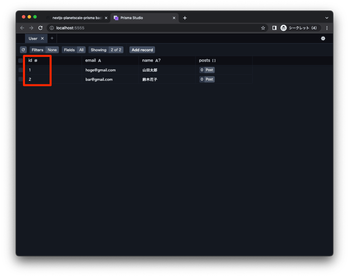 - Prisma を通して、テーブルを作成、データを投入します。