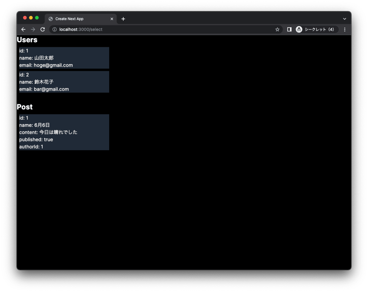 http://localhost:3000/select にアクセスすると、以下のようにデータが表示されます。