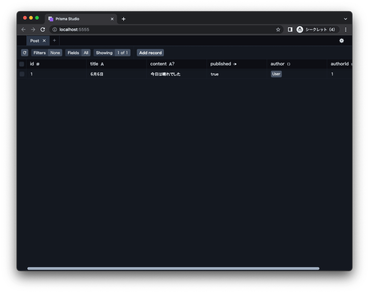 - Prisma を通して、テーブルを作成、データ投入しました。