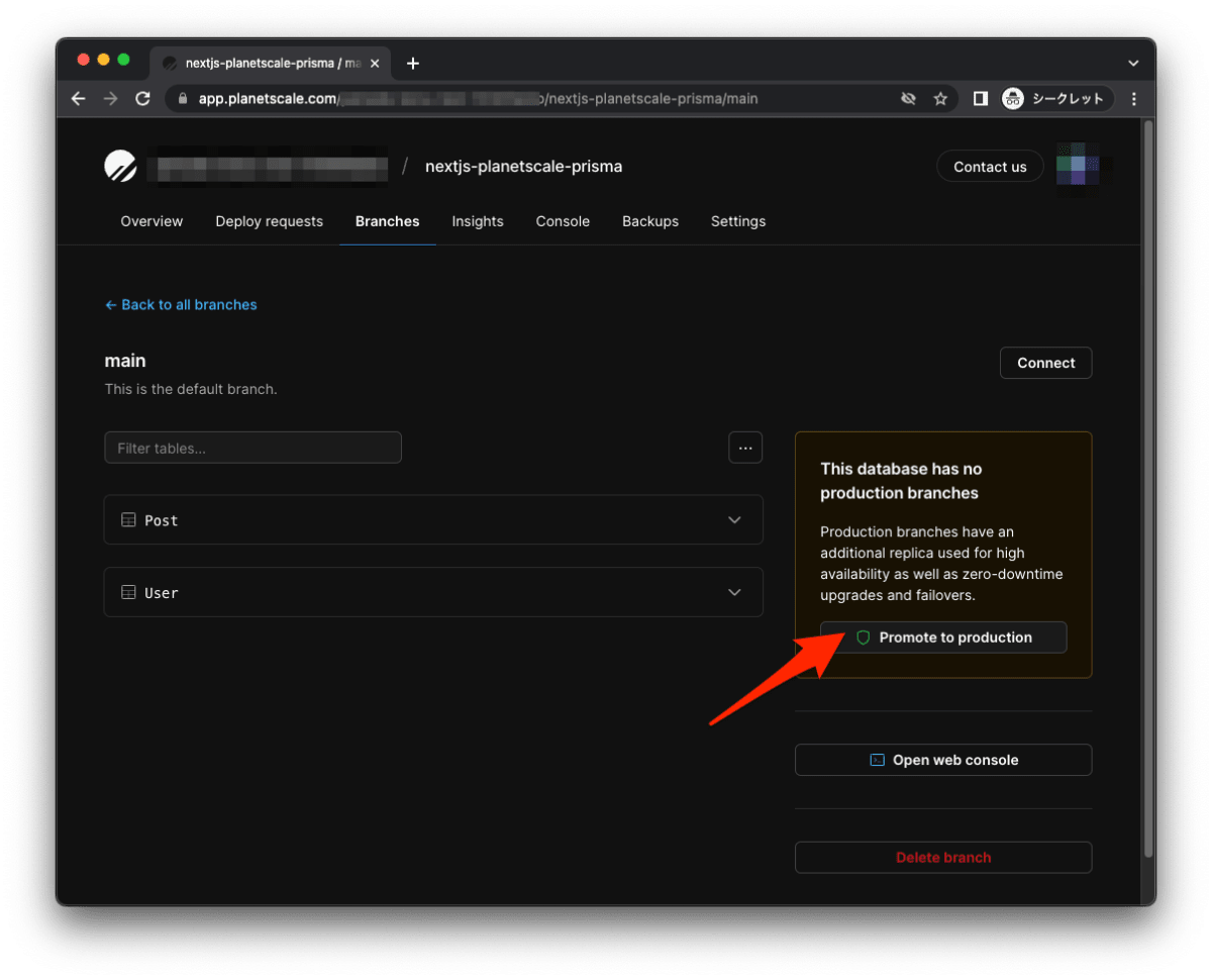 「Promote to production」をクリックして、商用ブランチにプロモートします。
