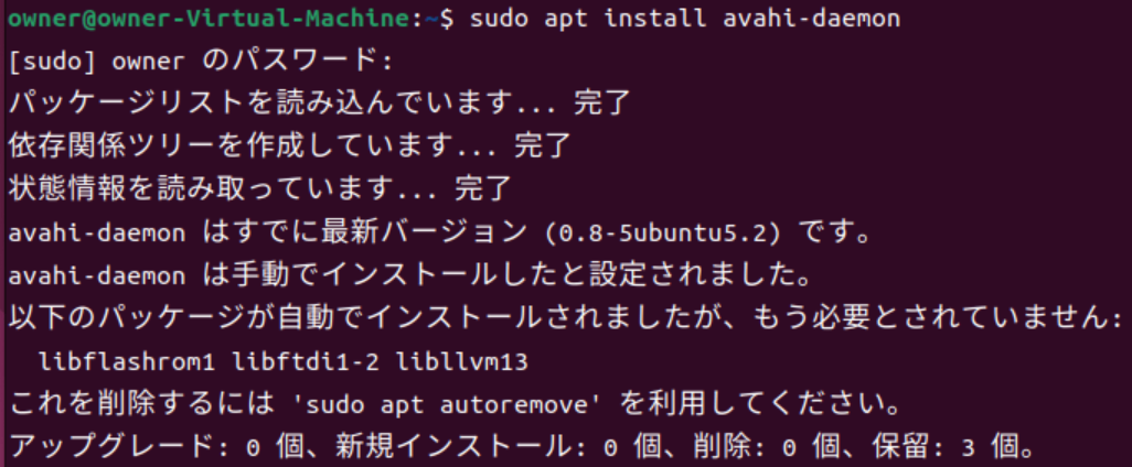 調べてみて初めて、自分が入れたのはUbuntuDesktopの方ですでにavahi-daemonはインストールされており、先輩社員の「なぜ入っているものをもう一度入れようとした?」というツッコミの意味が分かりました。