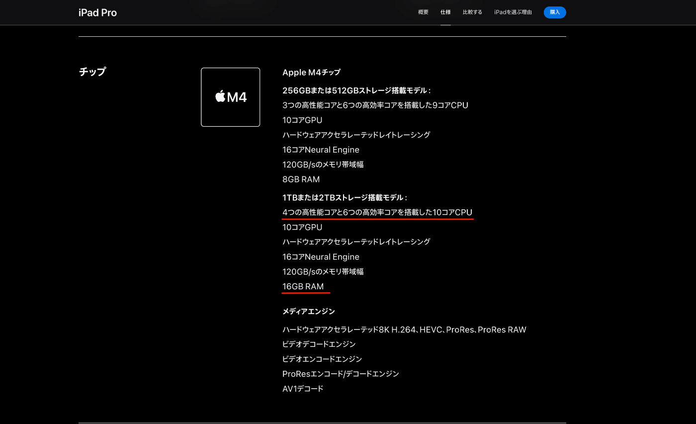 しかし、よくみてみるとストレージの256GB or 512GBか1TB or 2TBでよって中身のスペックが変わるようです...