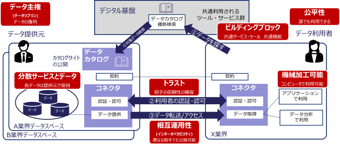 セマンティックなデータモデルやポリシー記述、暗号化通信などが組み込まれており、制度的にはガバナンス・法令・契約条件の標準化が同時に進められています。