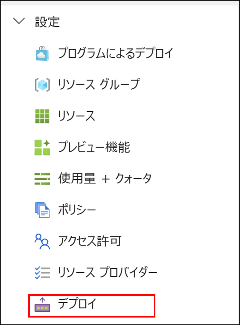- サブスクリプションの左タブの「設定 > デプロイ」をクリックする