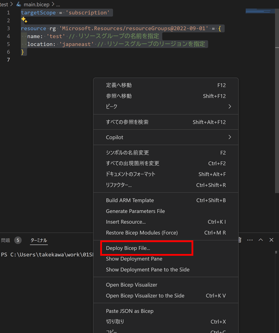 main.bicepファイルを右クリックして、「Deploy Bicep File...」をクリックする