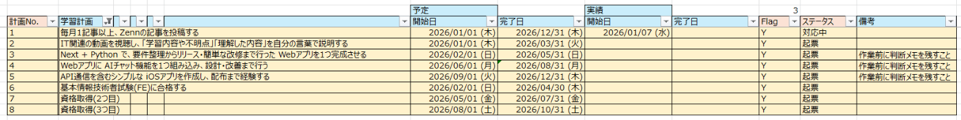 | 次の次を意識し、必要なアクションを自律的に判断する | 実装や学習の際、その先の設計・運用・拡張を意識した判断ができていない | 動き出す前に、「目的」「状況」「実施すること」「次に発生しそうな課題」をメモに書いて整理する |