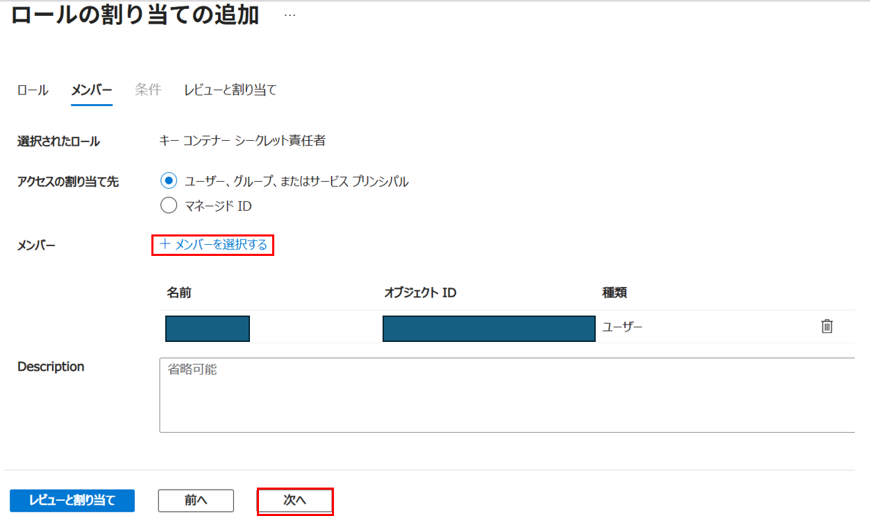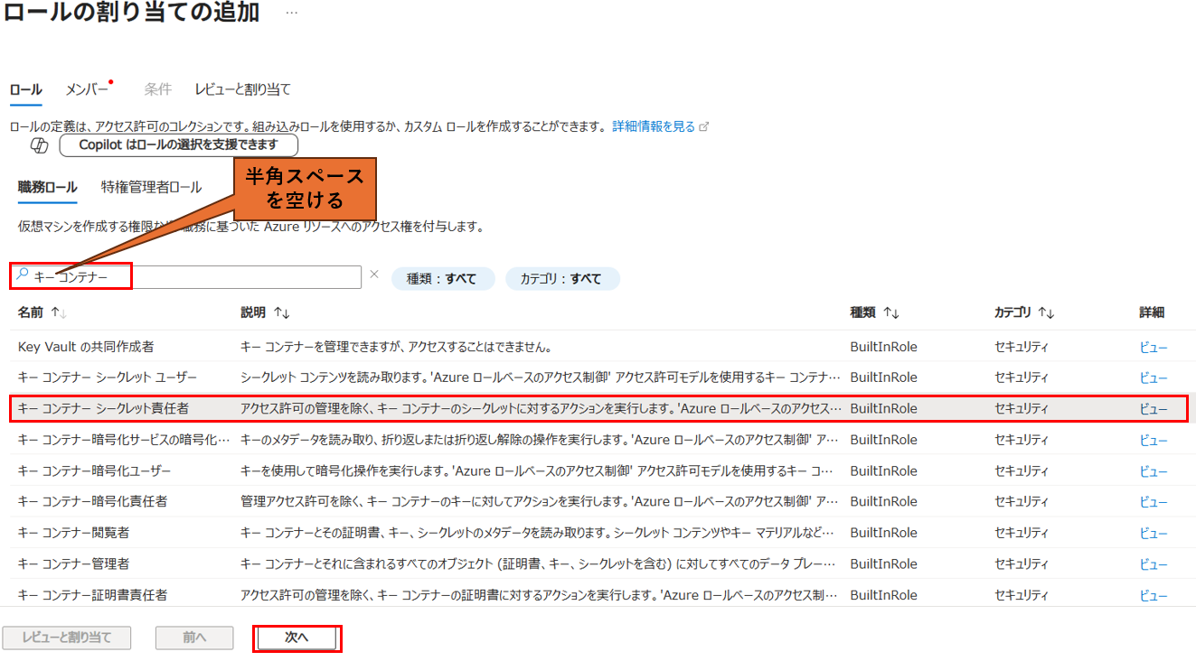 4. 『キー コンテナー』で検索し『キー コンテナー シークレット責任者』を選択し『次へ』を押下する。