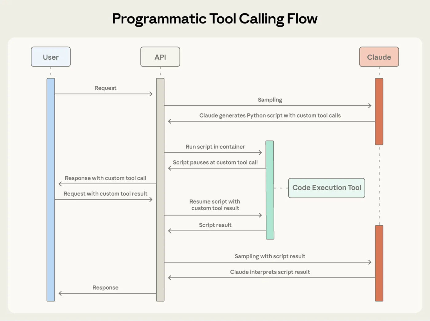 Programmatic Tool Callingでは、個別のツール呼び出しを繰り返すのではなく、ワークフロー全体をオーケストレーションするPythonスクリプトを作成し、実行します。(コード実行ツールのサンドボックス環境=コンテキスト外で行われます。)