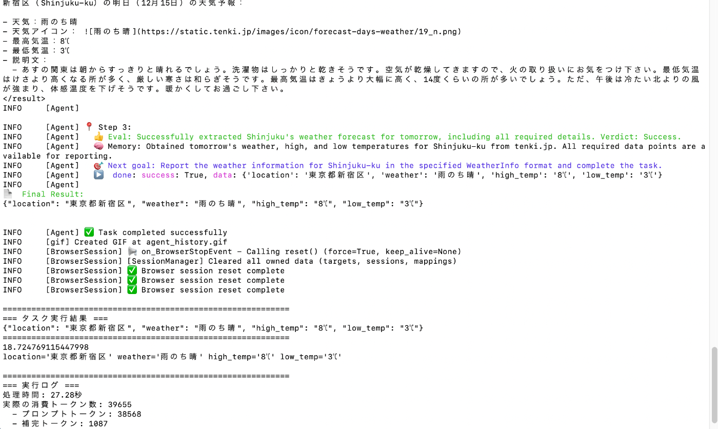 Agentにpage_extraction_llmを設定することで、ブラウザから情報を抽出する箇所は設定したモデルが担当するようにできます。