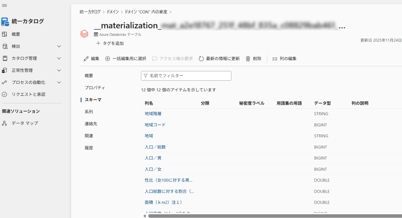スキャンされたUCの1テーブルを見ると、作成日付や所有者、スキーマが自動判別されている。