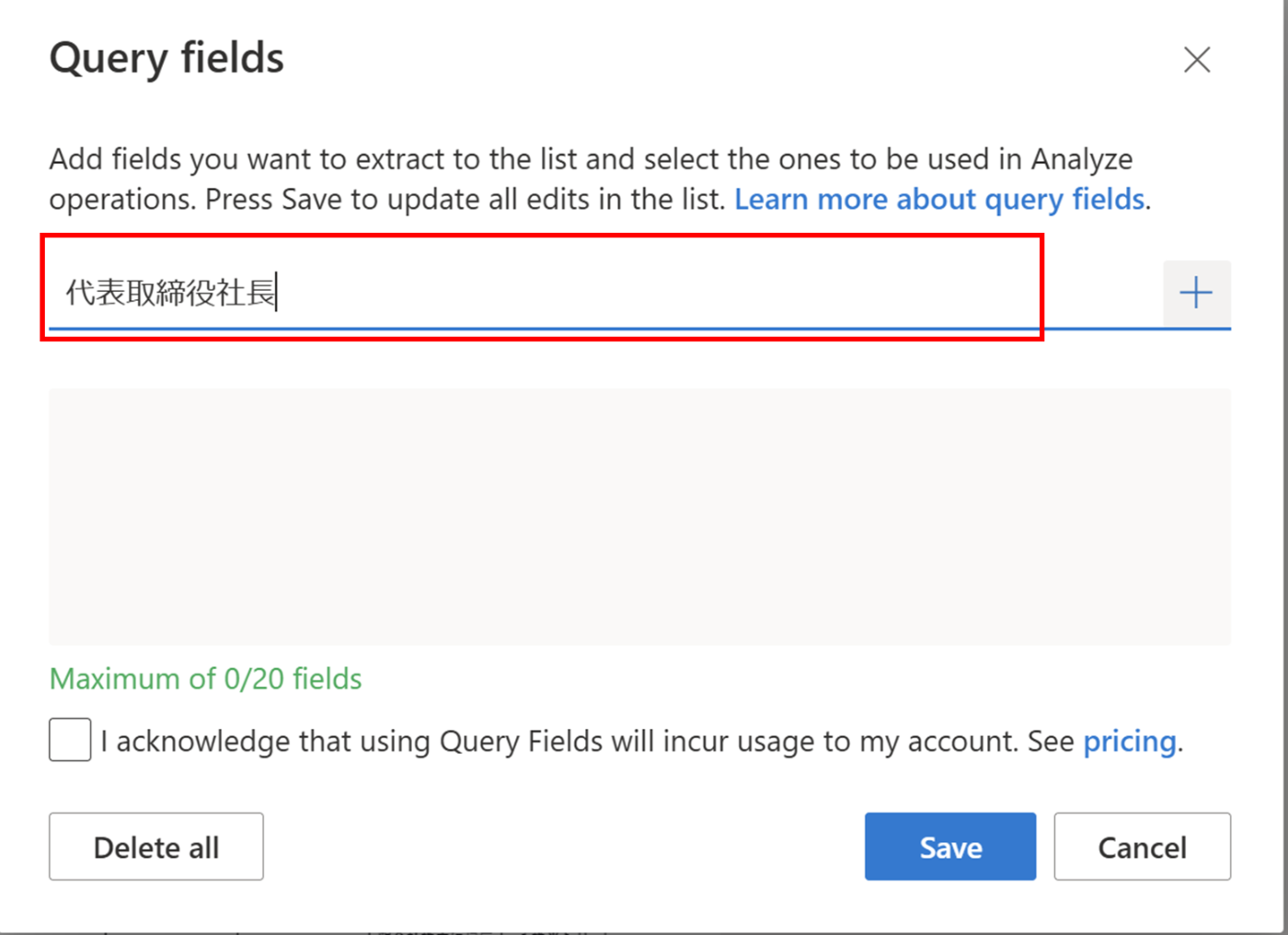 最大20の項目(Filed)を定義し、カスタムモデルのトレーニングを必要とせずモデルのカスタマイズができます。