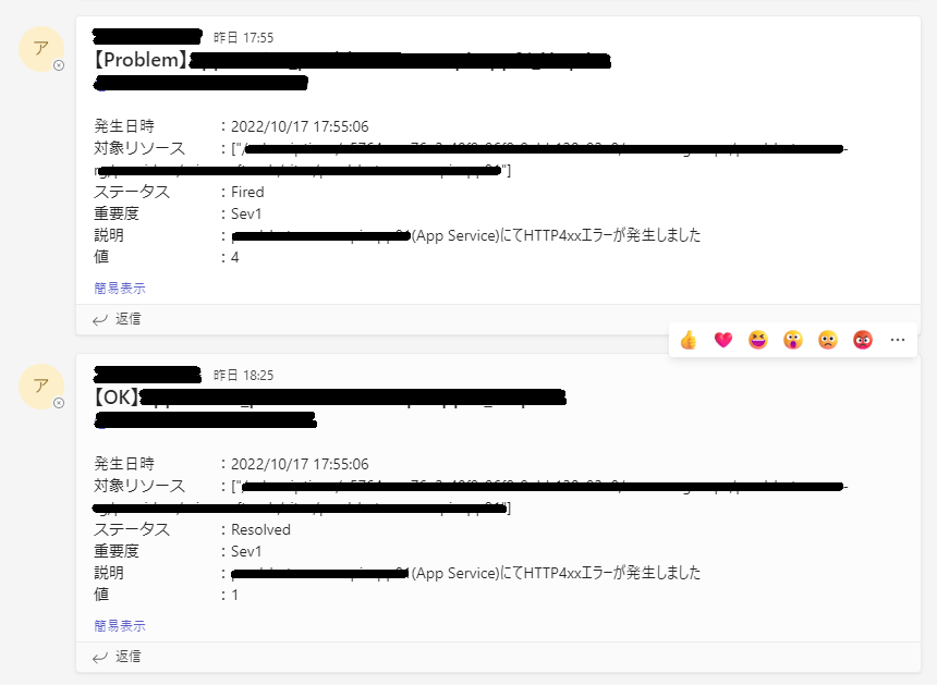 <p>発生日時 :@{convertFromUtc(string(triggerBody()?['data']?['essentials']?['firedDateTime']), 'Tokyo Standard Time', 'yyyy/MM/dd HH:mm:ss')}<br>\n対象リソース :@{triggerBody()?['data']?['essentials']?['alertTargetIDs']}<br>\nステータス :@{triggerBody()?['data']?['essentials']?['monitorCondition']}<br>\n重要度 :@{triggerBody()?['data']?['essentials']?['severity']}<br>\n説明 :@{if(equals(triggerBody()?['data']?['essentials']?['description'], ''), '-', triggerBody()?['data']?['essentials']?['description'])}<br>\n値 :@{if(equals(triggerBody()?['data']?['essentials']?['monitoringService'], 'Platform'), first(triggerBody()?['data']?['alertContext']?['condition']?['allOf'])?['metricValue'], '-')}</p>