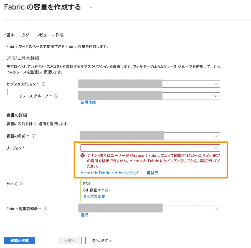 何も考えずにAzure PortalでMicrosoft Fabricの容量を作成しようとすると、下記のようなエラーが出ました。