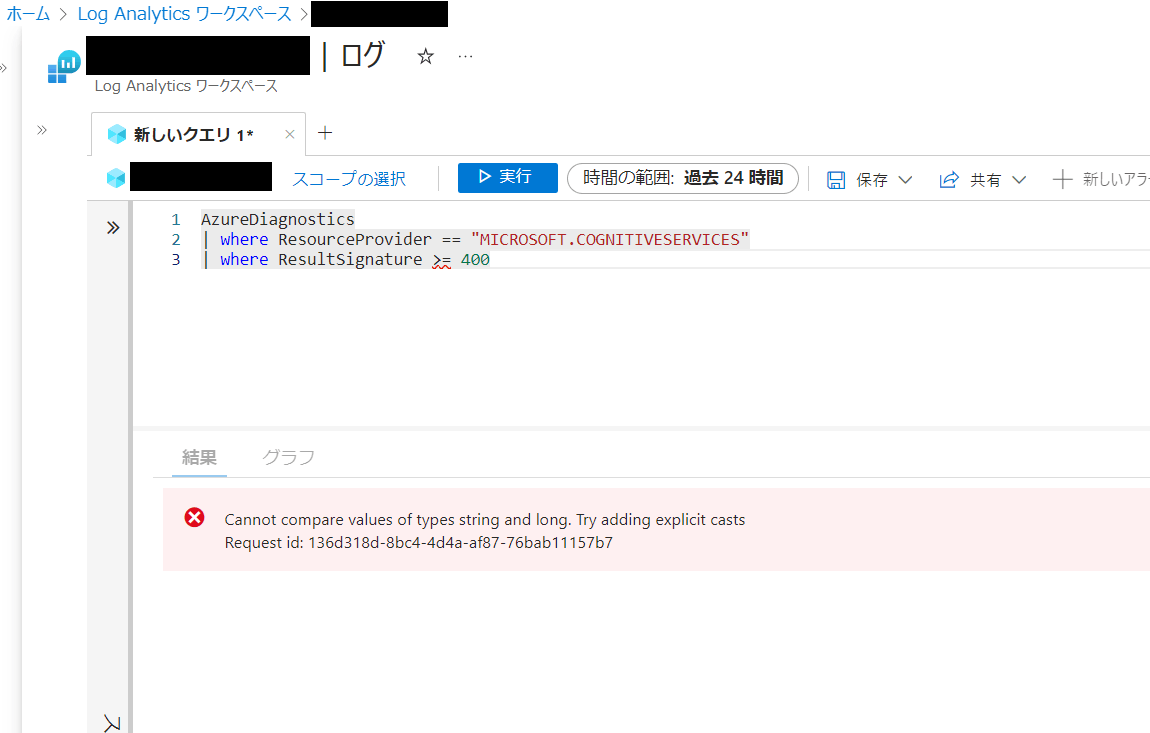 Azure Monitorのアラート設定にあたって、Azure AI ServiceのレスポンスログでresultSignature(HTTPステータスコード)が400以上のレコードを抽出したかったが、AzureDiagnosticsテーブル[1]のresultSignatureカラムはString型のため比較演算子を利用することができなかった。。