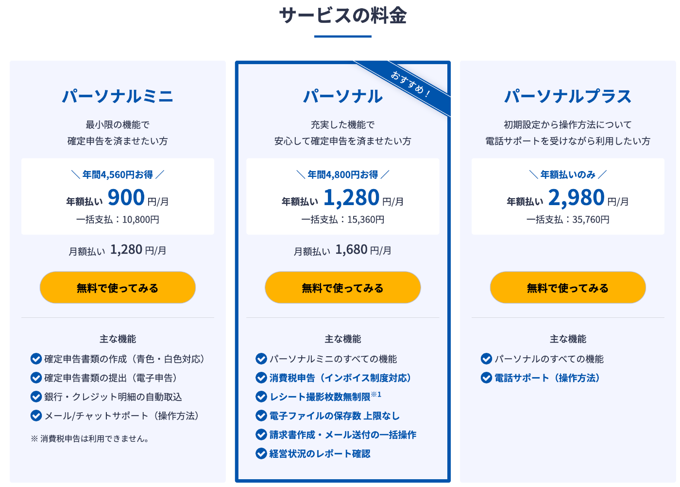 結論から言うと、マネーフォワードクラウド確定申告を使っています。選んだプランは、パーソナルです。パーソナルミニでも機能的には大体大丈夫なのですが、ミニだと電子ファイルのアップロードが5件/月が上限で、確定申告の時期にまとめて経費の電子ファイルをアップロードする必要があり(日頃から毎月対応していれば私の場合はミニで十分)、渋々パーソナルにしました。