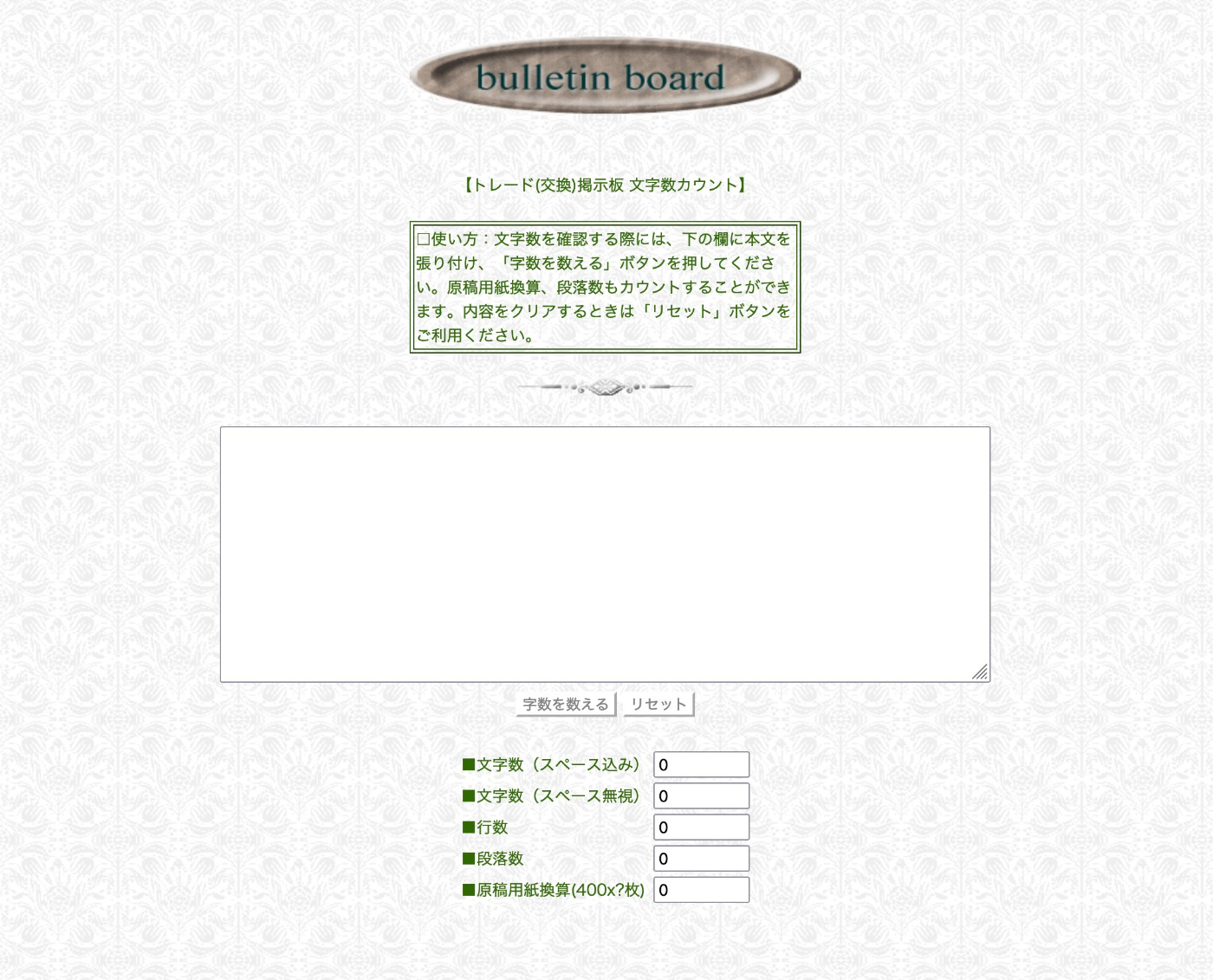 文字数カウントのページ自体が「Megukumaとチョコエッグの森の仲間達」というODNホームページサービスで作られた個人HPの1ページであり、どうやら掲示板(BBS)に投稿する本文の文字数確認用のために作られたらしい。