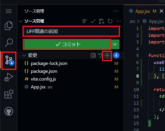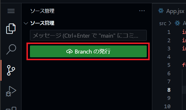 「ソース管理」をクリックし、「+」ボタンですべてステージし、適当なコミットメッセージを入れてからコミットします。