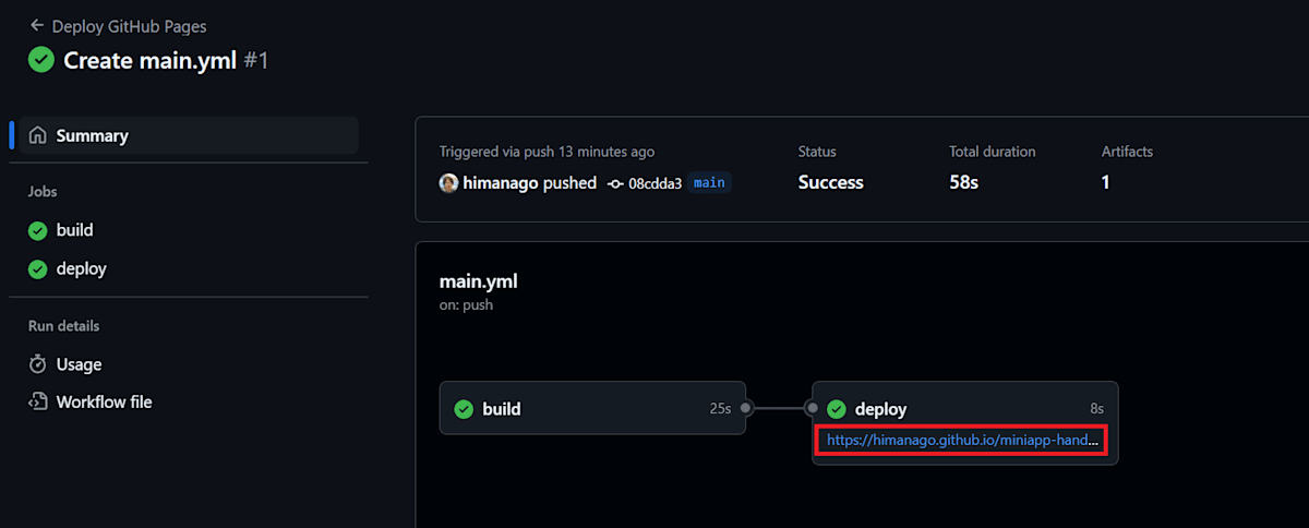 デプロイまで終わると、デプロイ先の Pages へのリンク URL が表示されるので、クリックして確認してみます。