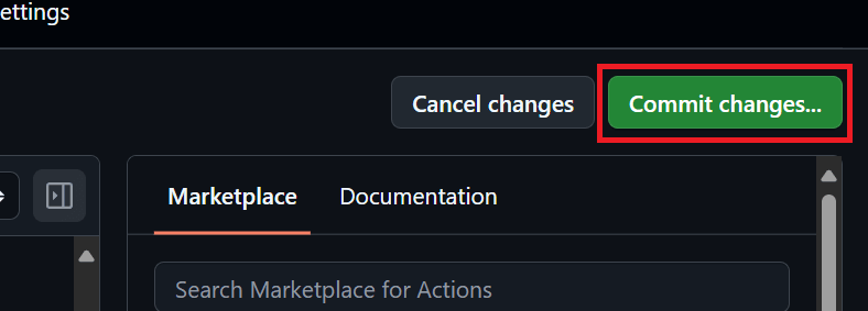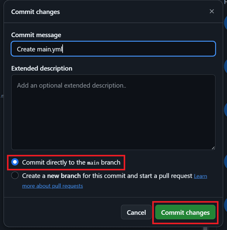 「Commit directly to the main branch」が選択されていることを確認し、「Commit changes」をクリックします。