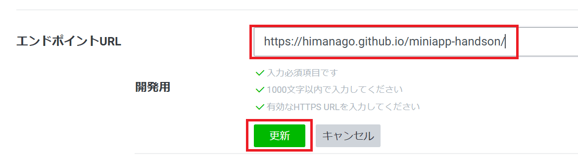 LINE Developers のタブに戻り、「エンドポイントURL」に貼り付けて「更新」をクリックします。