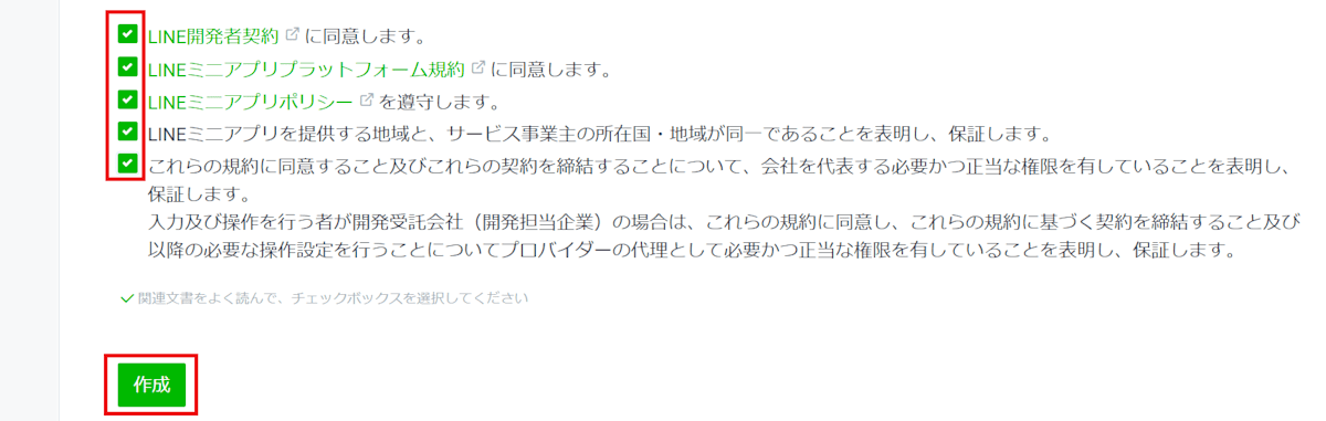 すべての同意確認のチェックボックスにチェックを入れ、「作成」をクリックします。