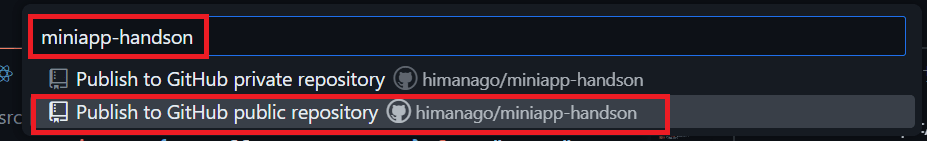 好きなリポジトリ名を入力して、「Publish to GitHub public repository」をクリックします。
