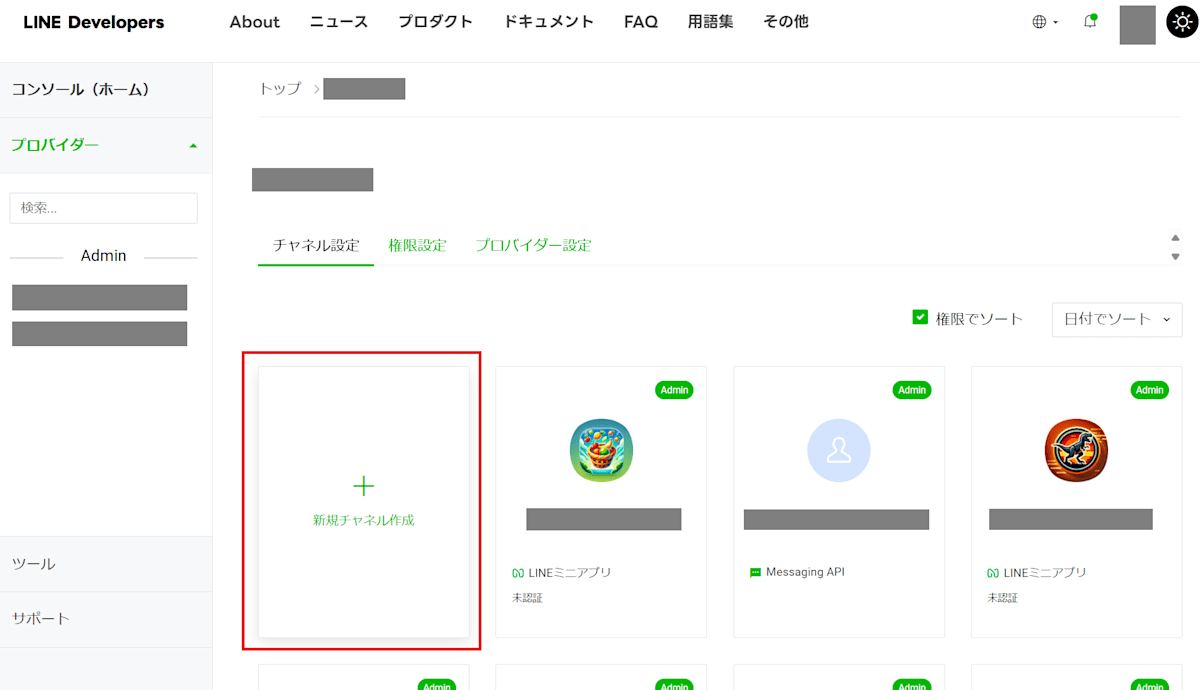 プロバイダーを新規作成または選択して、「チャネル作成」をクリックします。