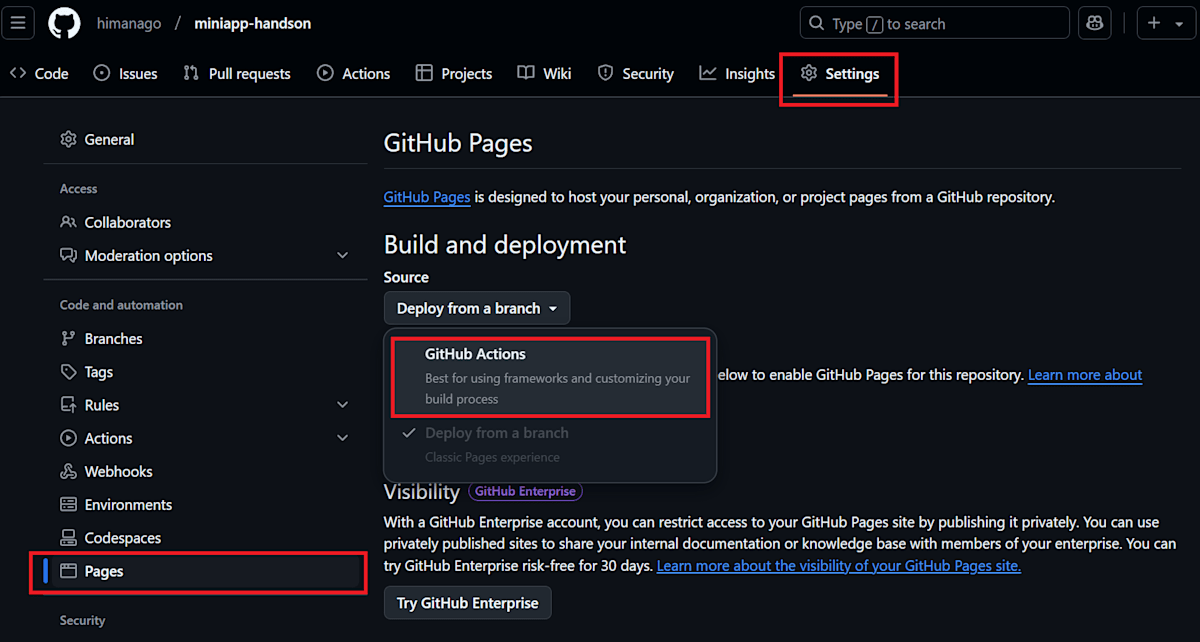 GitHub リポジトリの Settings > Pages とクリックし、「Build and deployment」の「Source」を GitHub Actions に変更します。