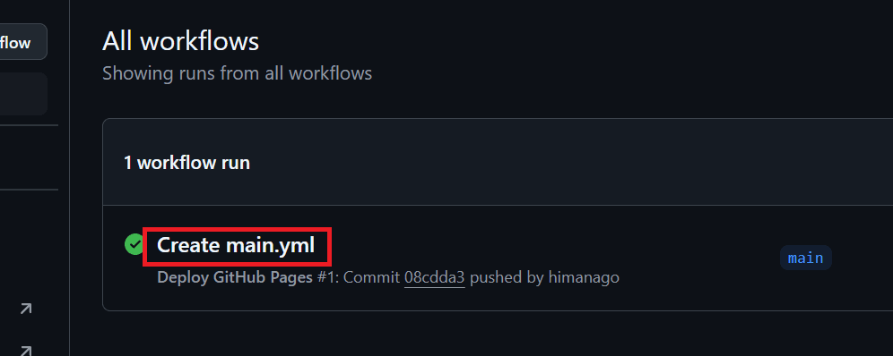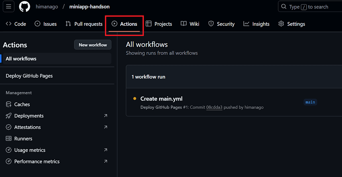 コミット後に「Actions」タブを開くと、ビルドが始まっているのが確認できます。