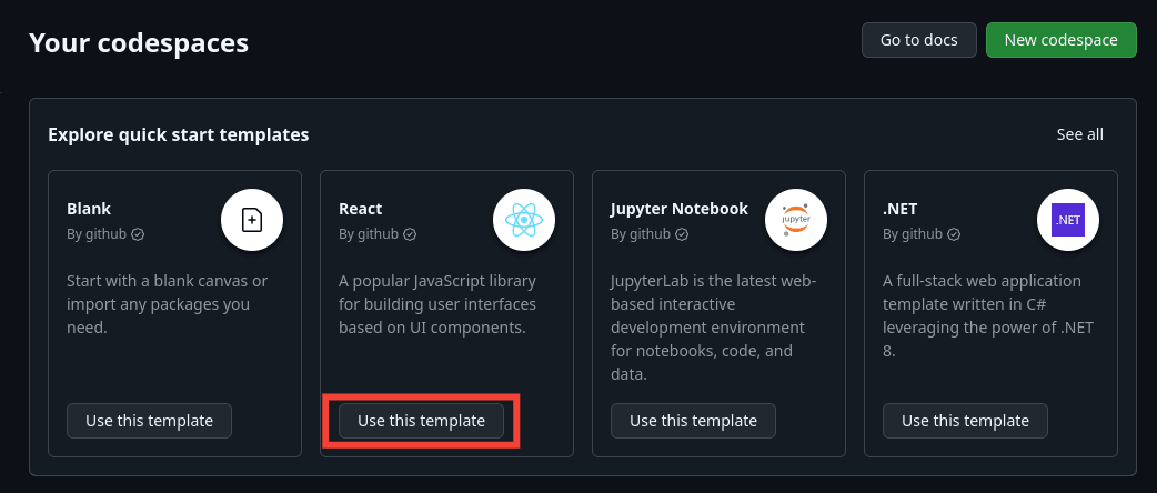 今回は React を使うので、「React」のテンプレートの「Use this tempalte」をクリックします。
