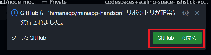 Codespace 右下に完了通知が表示されたら、「GitHub 上で開く」をクリックしてリポジトリを確認します(GitHub のリポジトリ一覧から探すのでも構いません)。