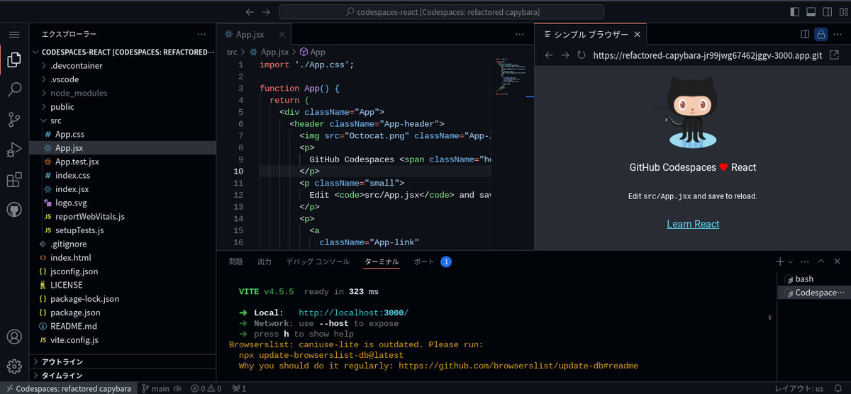 開くとこのように、はじめから React 開発ができる状態になっています。
