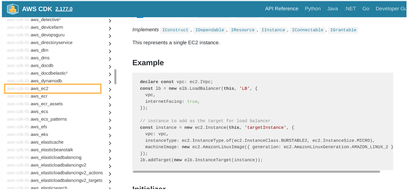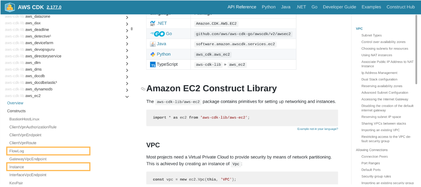 Constructsから、作成したいリソースのクラスを確認する。作成するリソースによって実装されているクラスは異なるので、例えばEC2インスタンスであれば