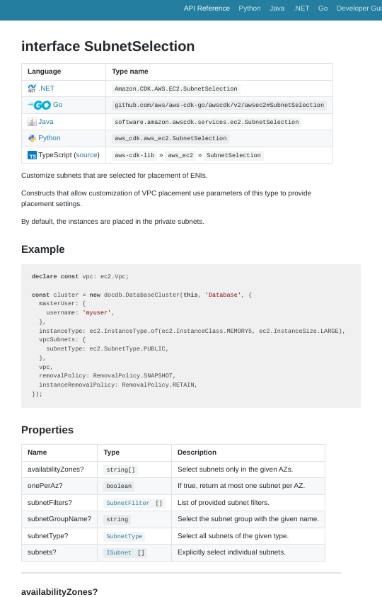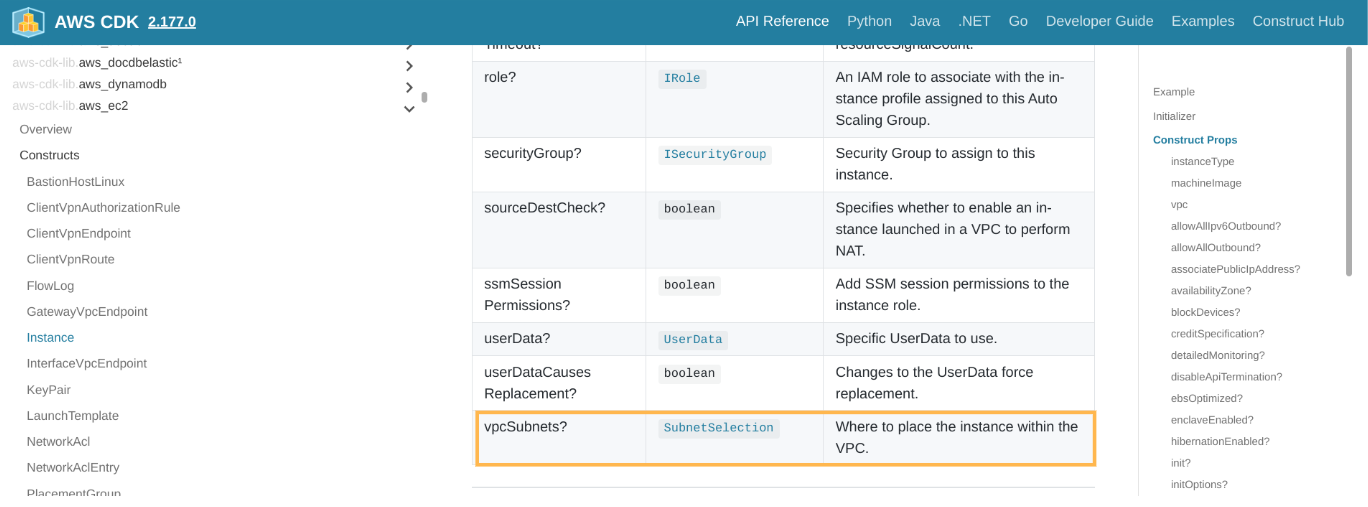 6.各パラメータの型を確認する。例えばInstanceクラスのvpcSubnets(インスタンスを配置するサブネットを指定するパラメータ)はSubnetSelection型とのこと。。青文字部分をクリックするとinterface SubnetSelectionページに飛んでくれるので、どんなプロパティを指定できるかを確認する。