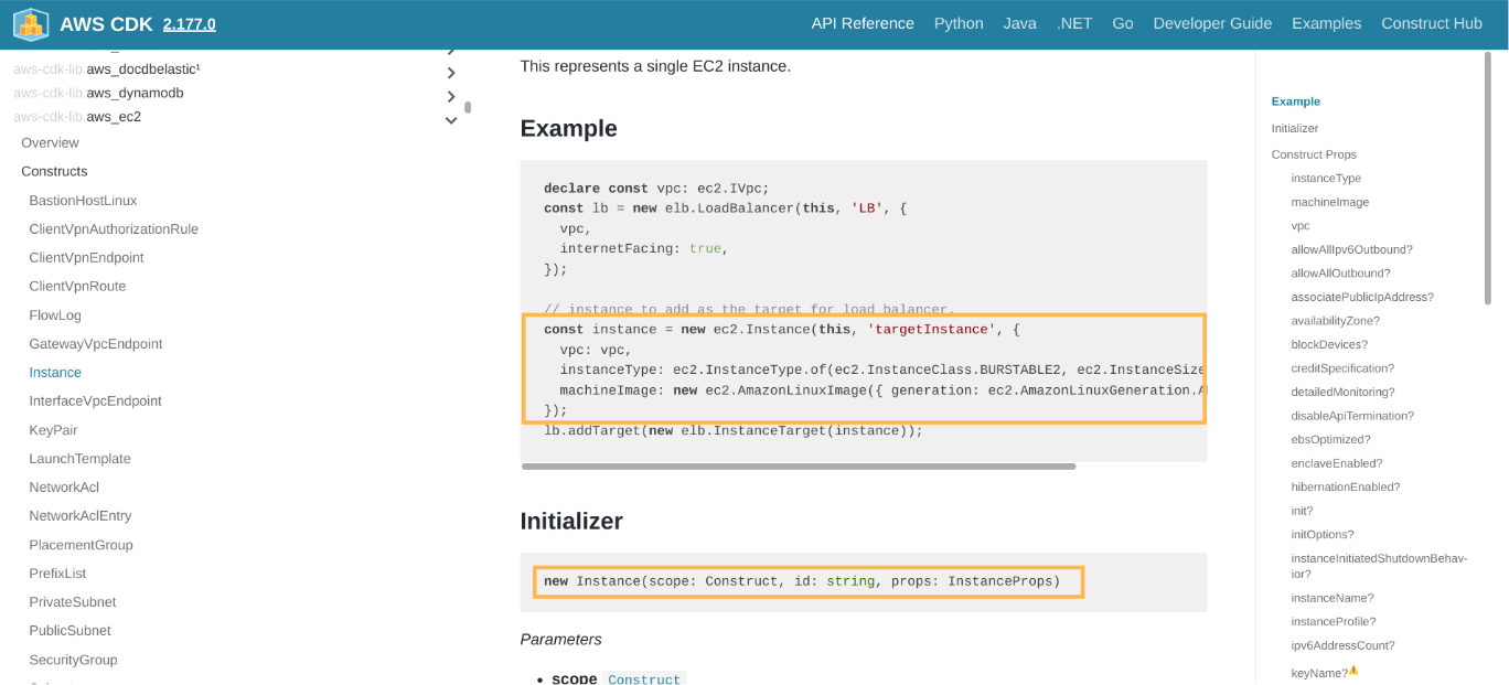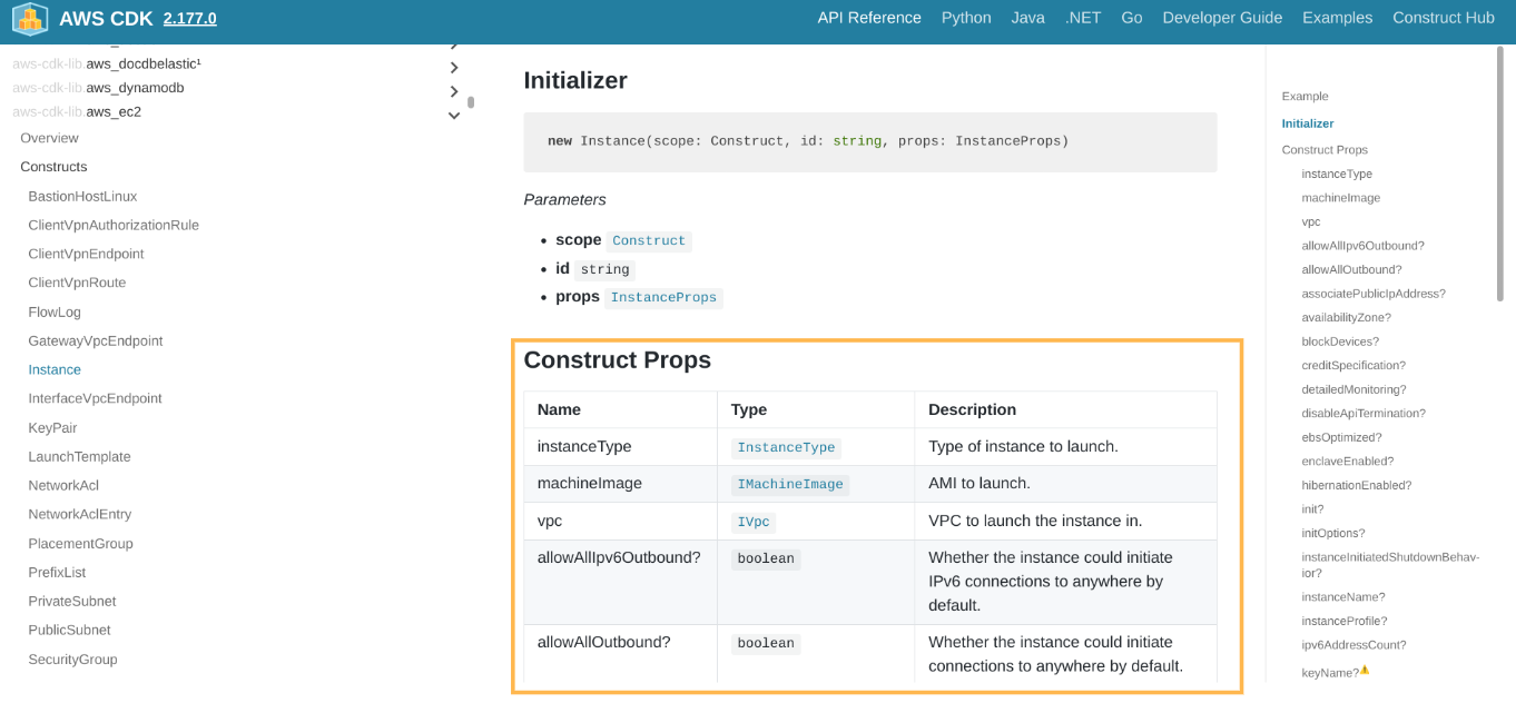 Construct Propsで、コンストラクタに渡すことができるパラメータを確認する。Nameに「?」がついていないものは必須パラメータである。「?」がついているものは、指定しなければデフォルト値が適用される。EC2インスタンスだと、インスタンスタイプ、マシンイメージ、インスタンスを配置するVPCは必須指定になっていることが分かる。