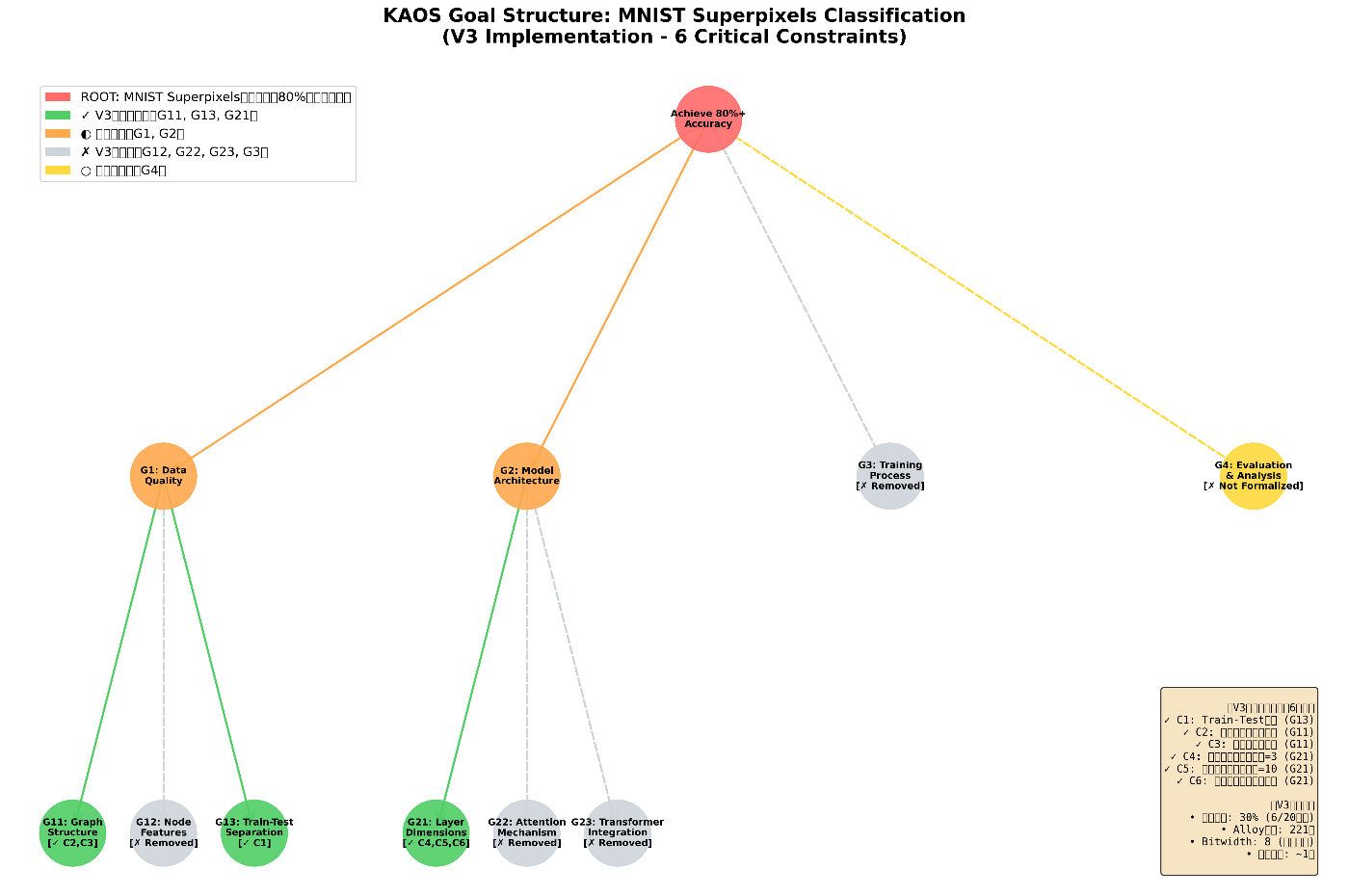 KAOS(ゴール指向分析)では、プロジェクトの目標を階層的に分解します。今回のMNIST分類では、以下のような構造になりました: