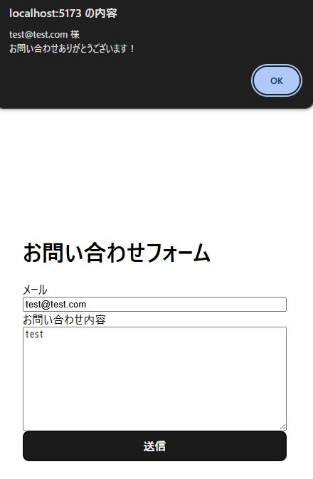 - alertで表示されるメールアドレスはuseStateでinputから取得しています。