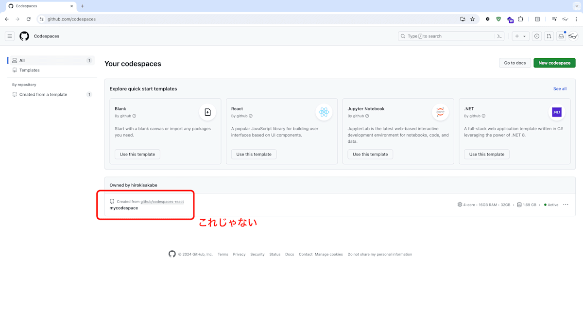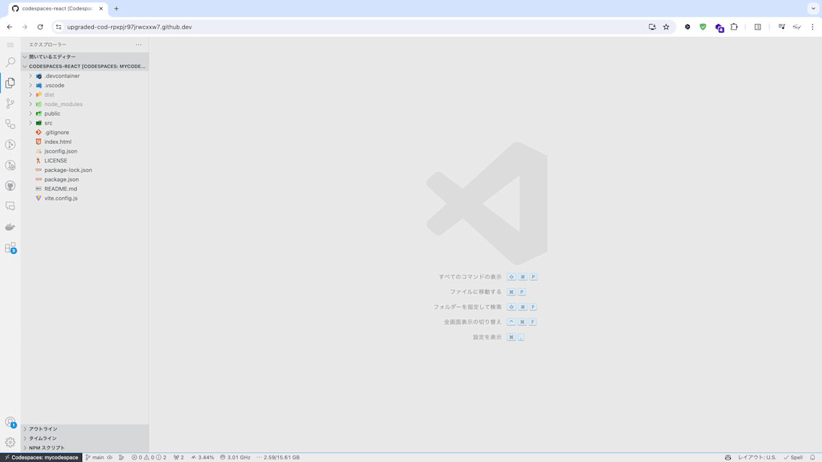 今回わたしが作成した Codespace の URL はhttps://upgraded-cod-rpxpjr97jrwcxxw7.github.dev/なので、codespace 名はupgraded-cod-rpxpjr97jrwcxxw7です。