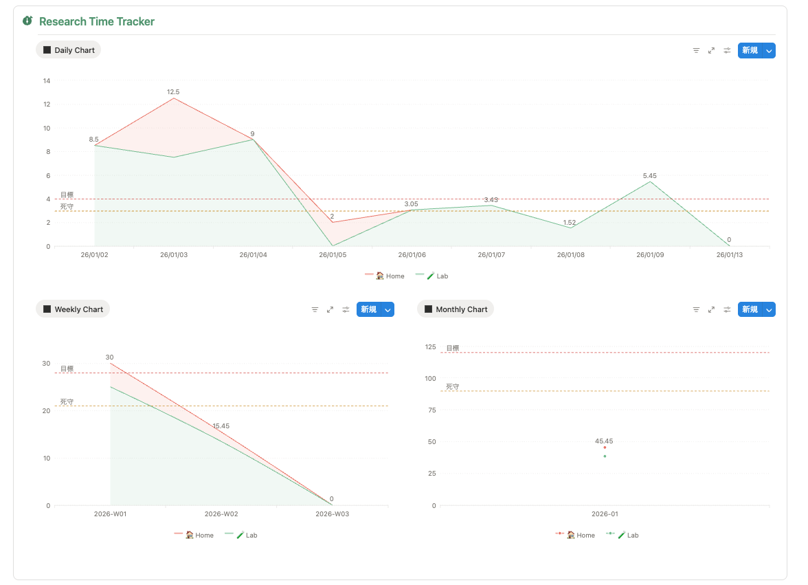 Notion のチャート機能を使って、日・週・月ごとの研究時間を可視化していきます。目標ライン と 死守ライン を設定することで、ヘルスチェックができるようになりました。