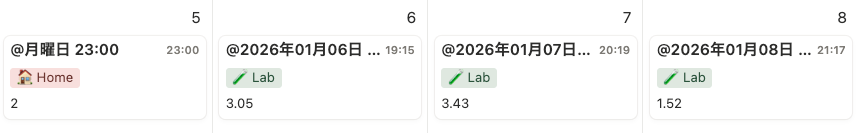 Notion のカレンダービューを追加して、いつ、どこで研究したかが一目でわかるようにしました。Lab や Home などのタグをつけることで、場所ごとの傾向も把握できます。