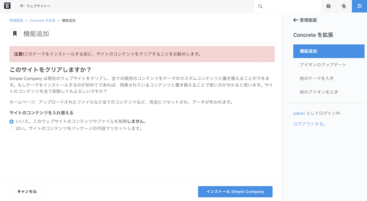 コンテンツの入れ替え時に、画面に表示する注意書きを設定することができます。パッケージディレクトリ内に elements/dashboard/install.php ファイルを作成すると、そのファイルが画面にインポートされます。この記事で紹介しているパッケージの場合は /packages/theme_simple_company/elements/dashboard/install.php になります。