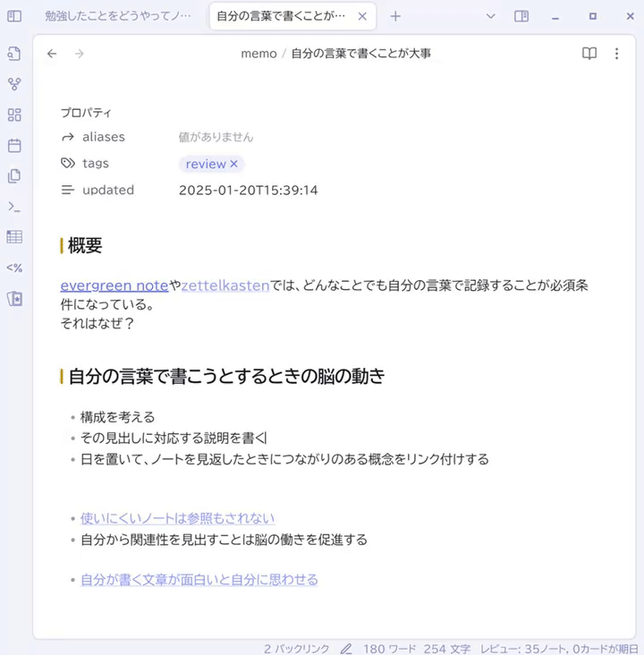 自分は、obsidian で作成したノートはすべて Spaced Repetition のレビュー対象にして、