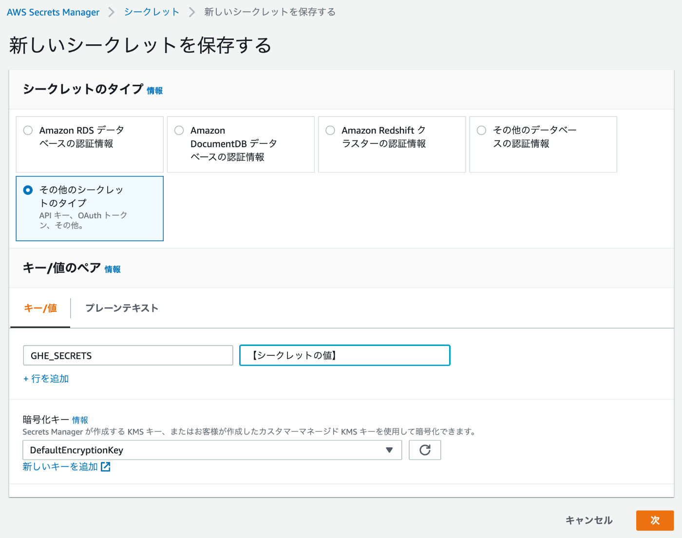 GitHub (Enterprise) から API Gateway 経由で Lambda 関数を呼び出す際に使うシークレット(文字列)をパスワードジェネレータなどで生成し、Secrets Manager にGHE_SECRETS