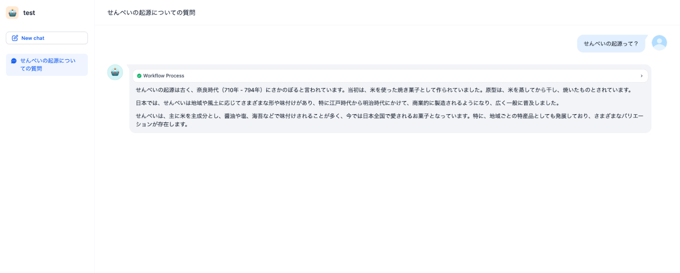 そうすると今回構築したチャットボットが実行できるので、適当になにか質問を投げてみてください