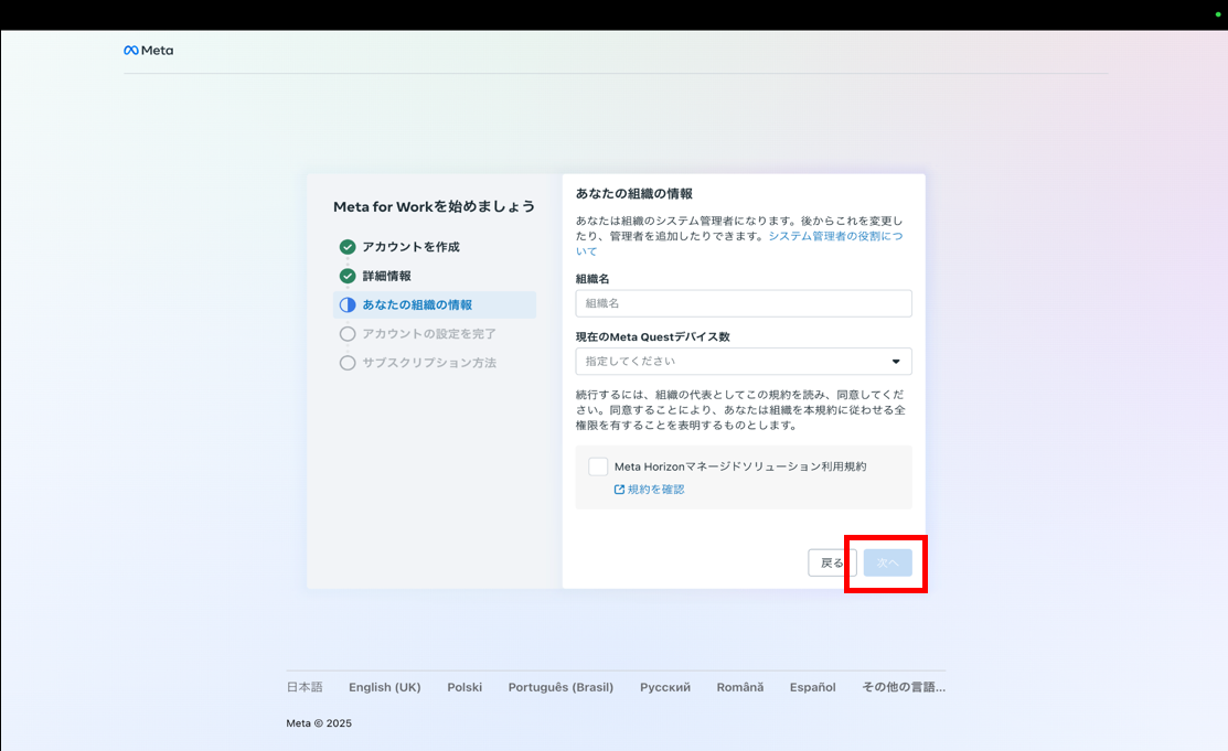 [あなたの組織の情報]を入力し、[次へ]を選択します。