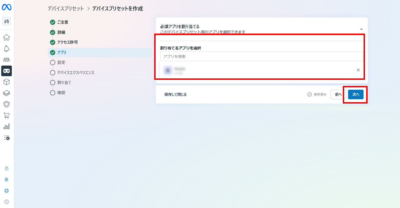 デバイスに自動的にインストールされるアプリを選択し、[次へ]を選択します。