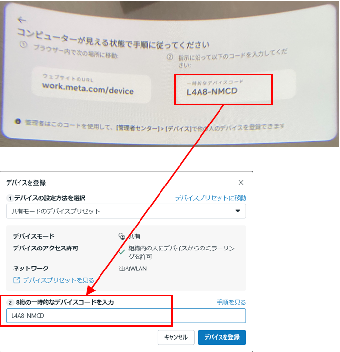 デバイスの[一時的なデバイスコード]を[デバイス登録]の[②8桁の一時的なデバイスコードを入力]に入力し、[デバイスを登録]を選択します。