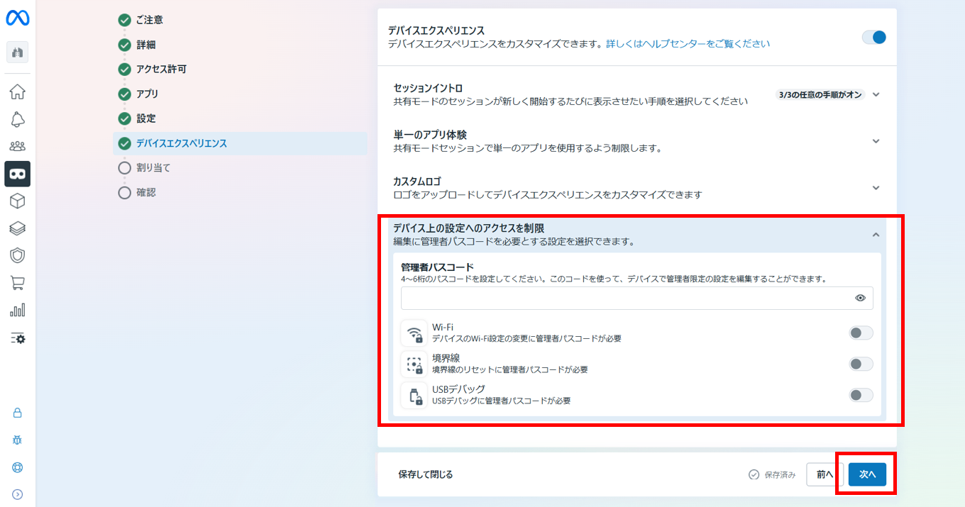 デバイス上の設定へのアクセスを制限では、管理者用のパスコード設定とWi-Fi、境界線、USBデバッグの可否を設定可能です。