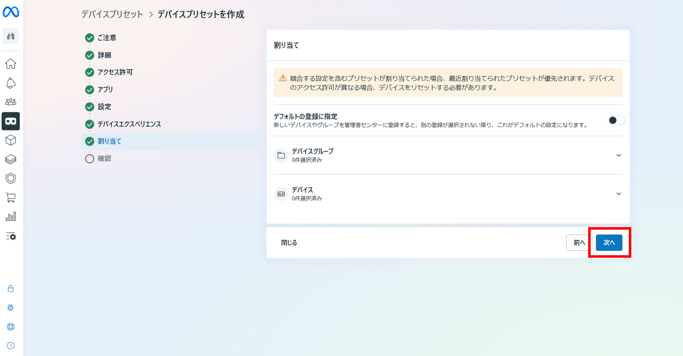 ここではデバイスを登録時にデバイスプリセットを指定するため設定せずに[次へ]を設定します。